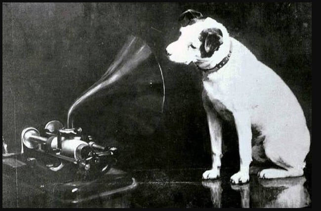 Dit is het originele beeldje van hondje Nipper, eveneens